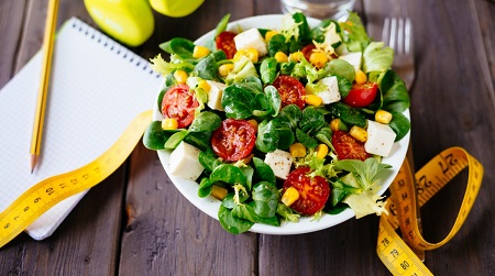 Fitness salad and measuring tabe on rustic wooden table. Mixed greens, tomatos, diet cheese, olive oil and spices for healthy lifestyle concept.