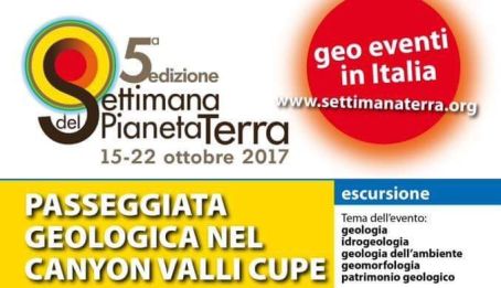 Domenica 22 ottobre la Riserva Naturale Valli Cupe prenderà parte alla quinta edizione della “Settimana del Pianeta Terra”, il festival scientifico nato nel 2012 con l’obiettivo principale di scoprire e valorizzare il patrimonio geologico e naturale italiano. Per un’intera settimana (dal 15 al 22 ottobre), diverse località sparse su tutto il territorio nazionale sono animate da escursioni, passeggiate nei centri urbani e storici, porte aperte nei musei e nei centri di ricerca, visite guidate, esposizioni, laboratori didattici e sperimentali per bambini e ragazzi, attività musicali e artistiche, degustazioni conviviali, conferenze, convegni, workshop, tavole rotonde. È prevista una “passeggiata geologica” nel Canyon Valli Cupe, unico in Italia per caratteristiche geo-morfologiche e ricco di specie vegetali di rara bellezza.