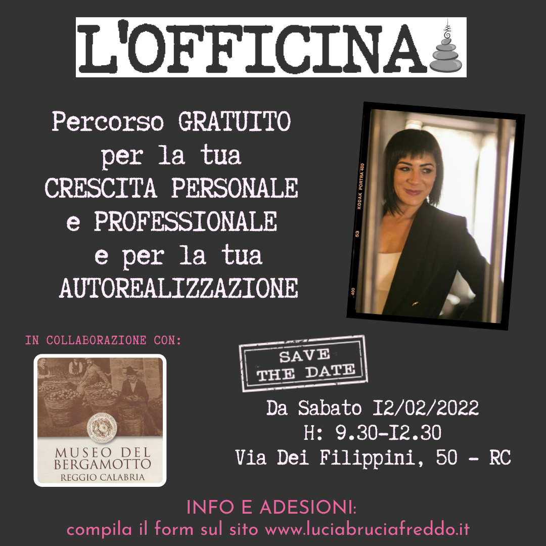 Prende vita a Reggio Calabria un nuovo progetto finalizzato alla crescita personale e professionale: “L’OFFICINA”, laboratorio esperenziale e percorso di formazione interamente gratuito, tenuto e organizzato dalla dott.ssa Lucia Bruciafreddo (psicologa, psicoterapeuta e life e mental coach), che si rivolge a chi intende realizzare sogni e cambiamenti della propria vita che da tempo desidera.