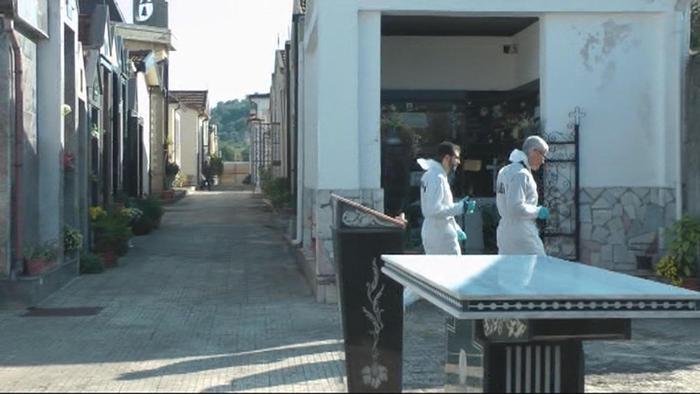 Carabinieri mentre eseguono rilievi nel cimitero di San Lorenzo del Vallo dove due donne, madre e figlia, sono state uccise a colpi d'arma da fuoco. Essa Costabile, 77 anni, e Ida Attanasio, 52, sono la madre e la sorella di Francesco Attanasio, arrestato nel maggio scorso per l'omicidio di Damiano Galizia, il cui cadavere era stato trovato in un appartamento a Rende. Cosenza, 30 ottobre 2016. ANSA/ Elvira Madrigrano