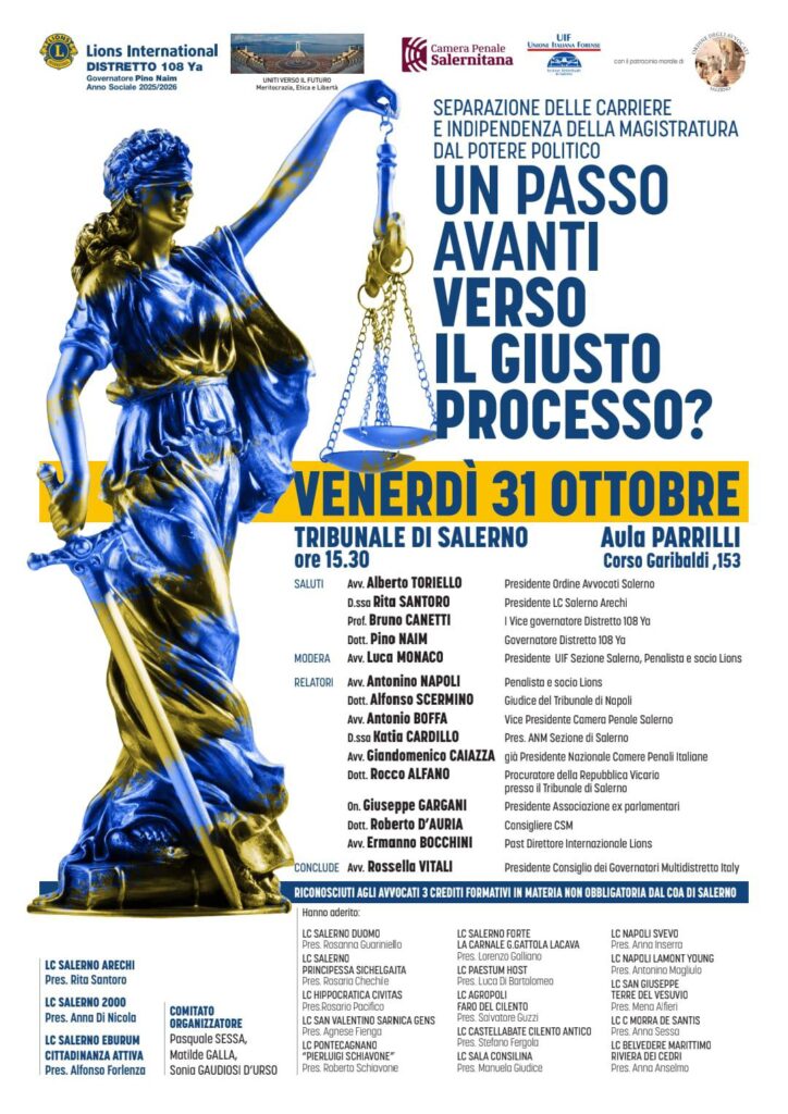 “Un passo avanti verso il giusto processo?”, questo il titolo del convegno, promosso dai club Lions del Distretto 108Ya, in programma oggi, 31 ottobre dalle 15,30 all’Aula Parrilli, del vecchio Palazzo di Giustizia di Salerno. Un appuntamento dedicato alla riforma della giustizia, con la partecipazione di esponenti della Magistratura, dell’Avvocatura, del CSM. A parlare di “Separazione delle carriere ed indipendenza della magistratura dal potere politico. Un passo avanti verso il giusto processo?” saranno, dopo i saluti dell’avv. Alberto Toriello, presidente dell’ordine degli avvocati di Salerno: