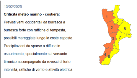 Previsti venti occidentali da burrasca a burrasca forte con raffiche di tempesta, possibili mareggiate lungo le coste esposte. Precipitazioni da sparse a diffuse in esaurimento, specialmente sul versante tirrenico accompagnate da rovesci di forte intensità, raffiche di vento e attività elettrica.