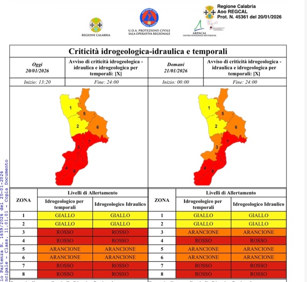 Non si placa il maltempo in Calabria, la Protezione Civile a seguito del perdurare delle condizioni temporalesche e di forti raffiche di vento che stanno creando disagi in alcune zone della Calabria, e principalmente sia nel Catanzarese come nel Reggino, prevalentemente sulla parte Ionica, è stata confermata l’allerta rossa anche per domani su buona parte della Regione, ma principalmente nel Reggino sia nella zona tirrenica che ionica.