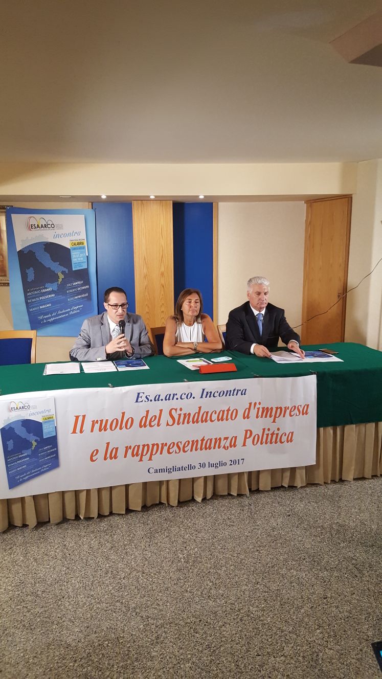 Si è svolto a Camigliatello Silano il convegno “Il ruolo del Sindacato d’impresa e la rappresentanza Politica” organizzato dalla Confederazione ES.A.AR.CO. Sono intervenuti il presidente della Confederazione ESAARCO, Antonio Eramo, l’On. Renata Polverini ed il Consigliere regionale On. Mario Magno. All’incontro era presente una larga partecipazione di amministratori calabresi e di numerosi amici dell’On. Mario Magno. Ha introdotto i lavori il presidente ESAARCO Antonio Eramo che ha illustrato “la miriade di servizi svolti dalla Confederazione che non tutelano solo gli interessi delle aziende ma anche dei lavoratori e delle famiglie”. ES.A.AR.CO, per garantire il mantenimento dei servizi, chiede l’intervento ed il sostegno della politica.