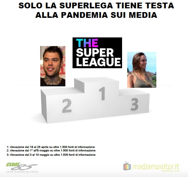 ROMA (ITALPRESS) – Solo la Superlega europea riesce a tenere testa alla pandemia, almeno sui mezzi di informazione italiani. Nella settimana dal 18 al 25 aprile scorsi, infatti, l’ambizioso progetto di un torneo fra i club calcistici europei più prestigiosi, naufragato nel giro di 48 ore, ha raccolto su carta stampata, radio e tv nazionali 23.577 citazioni: quasi la metà della voce “pandemia” (60.531) e circa un quarto di “Covid” (90.464), ma superiori del 37% a quelle ottenute da Fedez con il suo intervento al concertone del 1° maggio (8.739) e del 33,5% alle menzioni degli incidenti sul lavoro che hanno funestato i primi giorni di questo mese (7.930).
