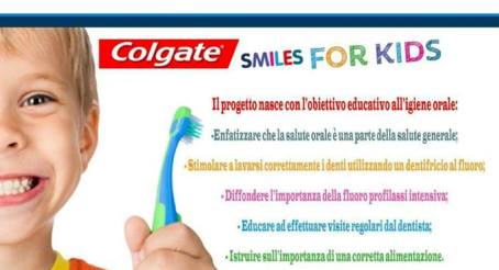 Nelle giornate di martedì 23 e mercoledì 31 maggio 2017, l’Amministrazione Comunale di Melicucco, in collaborazione con il CENTRO ODONTOIATRICO DI ESTETICA DENTALE del dott. Francesco Minasi ed il progetto NEW COLGATE SMILES FOR KIDS, distribuirà nelle Scuole Elementari e Medie un Kit per l’igiene dentale. Il progetto che vede protagonista l’Amministrazione Comunale ha come obiettivo educativo l’igiene orale, ed in particolare: