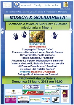 E’ sempre più imminente lo spettacolo di beneficenza che si terrà il prossimo 28 luglio alle ore 19 nell’atrio di palazzo Butera a Bagheria. L’evento è dedicato ad una donna straordinaria, suor Enza Guccione, missionaria in Nigeria da 16 anni.