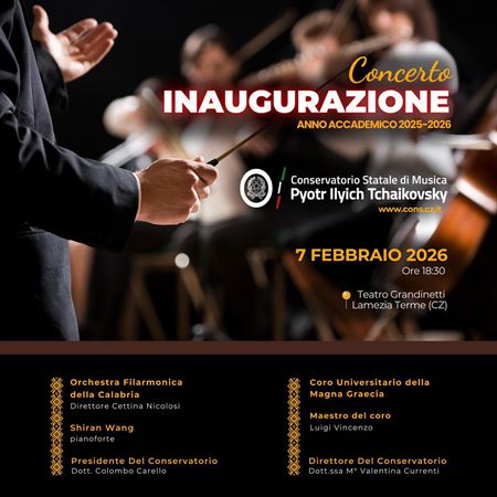 Il Conservatorio “P. I. Tchaikovsky” inaugura ufficialmente l’Anno Accademico 2025/2026 con un concerto di grande prestigio in programma sabato 7 febbraio 2026 ore 18:30 presso il Teatro Grandinetti di Lamezia Terme.