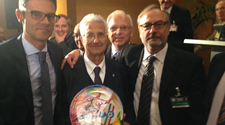 Il Vicepresidente Giovanni Verduci ha omaggiato il Presidente Nino Cosentino con una ceramica realizzata per l’occasione dall’artista reggina Aurelia Nania e raffigurante il logo della Lega Nazionale Dilettanti.