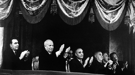 Taking time off from pressing problems on the international scene, Soviet Premier Nikita Khrushchev (second from left) applauds heartily at a performance of the opera “Boris Gudonov” starring New York Metropolitan Opera Basso Jerome Hines, at the Bolshoi Theatre in Moscow on Oct. 23, 1962. The line-up includes left to right are: Soviet President Leonid Brezhnev Khrushchev, Rumanian President Gheorghe Gheorghiu-Dej, Rumanian Premier Ion Gheorghe Maurer, Rumanian Foreign Minister Korneliu Menescu and Soviet Deputy Premier Anastas Mikoyan. (AP Photo/M)