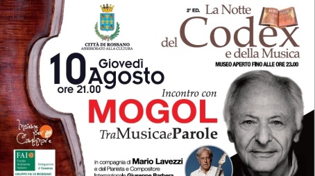 2° edizione della NOTTE DEL CODEX E DELLA MUSICA. GIOVEDÌ 10 AGOSTO l’incontro tra MUSICA E PAROLE con MOGOL si terrà alle ORE 21 in Piazza STERI. La location è stata scelta appositamente per poter consentire a tutti di poter fruire di questo momento culturale. Ad accompagnare l’Autore saranno Mario LAVEZZI ed il pianista e compositore internazionale Giuseppe BARBERA. L’evento, sponsorizzato da BUSITALIA FAST SIMET, è promosso in collaborazione con l’associazione INSIEME PER CAMMINARE ed il gruppo FAI di ROSSANO, a battesimo con la prima iniziativa culturale in programma per le ORE 19,30, con la VISITA DELLA TORRE DELL’OROLOGIO guidata dal prof. Franco FILARETO ed il contest fotografico FAI…UN SELFIE DALLA TORRE. Per gli iscritti FAI è prevista una riduzione del 20% sul biglietto d’ingresso al Museo Diocesano e del Codex che per l’occasione rimarrà aperto fino alle ORE 23.