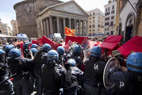 Il primo contatto con le forze dell’ordine c’e stato a piazza Capranica quando un gruppo ha tentato di forzare il cordone con l’intento di entrare a Montecitorio. Alla carica di contenimento i manifestanti hanno replicato con un lancio di fumogeni e sampietrini. Un agente è rimasto ferito.