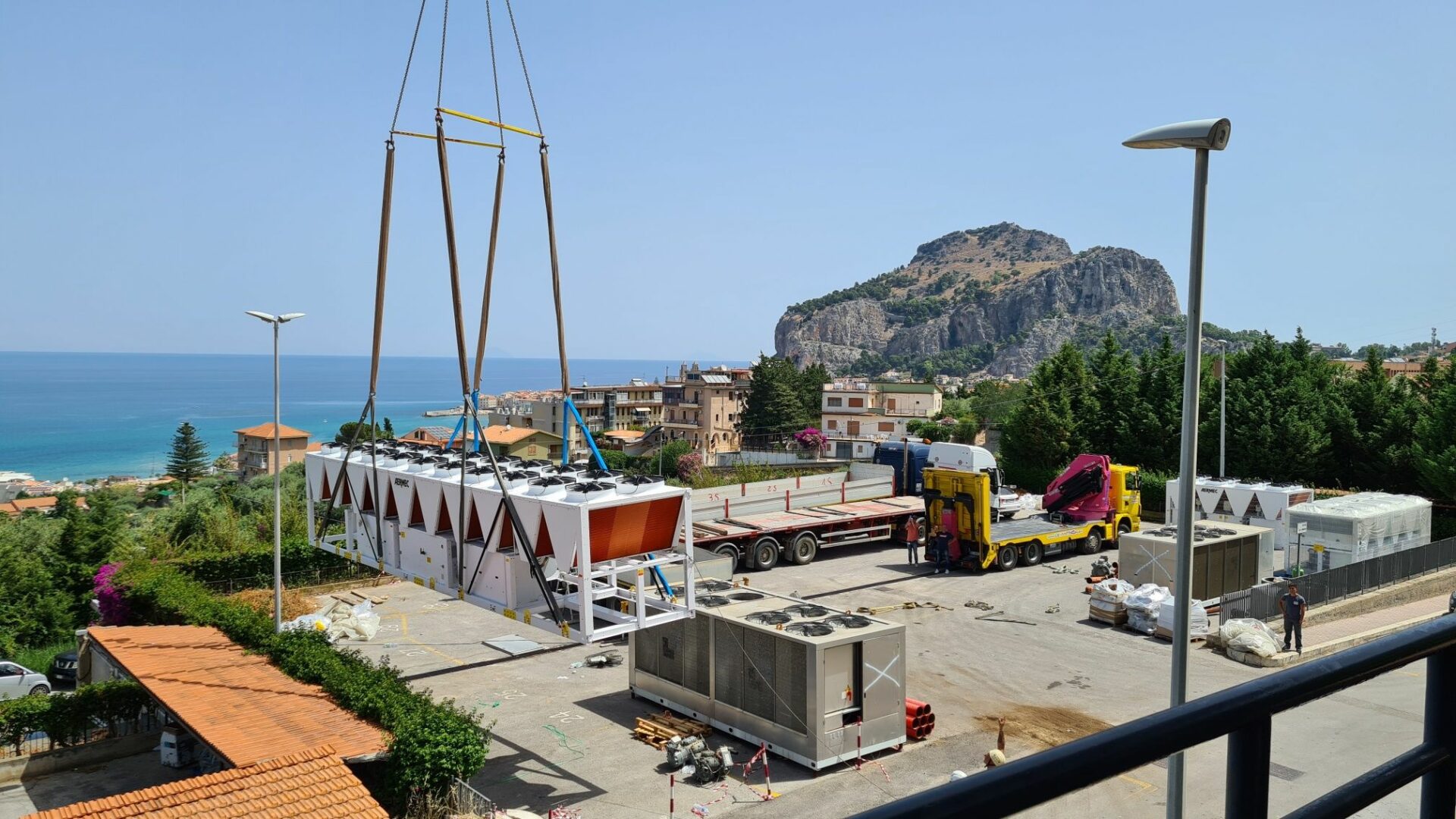 Il primo intervento, già in corso e che si concluderà mercoledì sera, prevede la sostituzione degli impianti di climatizzazione esistenti con blocchi frigo di ultima generazione che consentono di ridurre le emissioni di CO2 in atmosfera e un abbattimento dei consumi energetici di del 35%. Le operazioni di tiro in quota dei nuovi impianti vengono effettuati con gru semovente da 400 tonnellate.