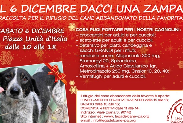Il prossimo 6 dicembre, a Palermo, i volontari del “Rifugio del Cane Abbandonato della Favorita” saranno presenti in Piazza Unità d’Italia dalle 10 alle 18 per la raccolta di croccantini e farmaci.