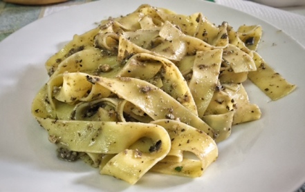 - In una casseruola versate il pesto di olive nere e le pappardelle aggiungendo il mestolo d’acqua di cottura.