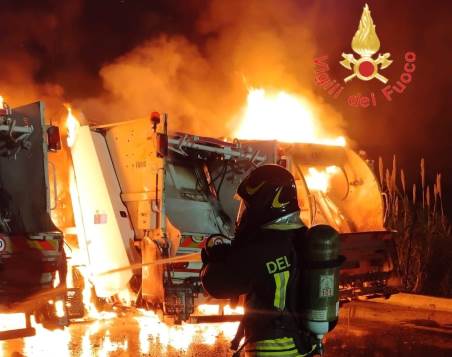 Interessati dal rogo n. 8 automezzi adibiti alla raccolta di rifiuti solidi urbani, n. 1 automezzo spazzatrice e n. 1 scuolabus andati completamente distrutti.