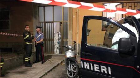 Vigili del fuoco e carabinieri all'esterno del palazzo dove un anziano è stato ritrovato morto in casa a Cagliari, 3 giugno 2019. ANSA/MANUEL SCORDO