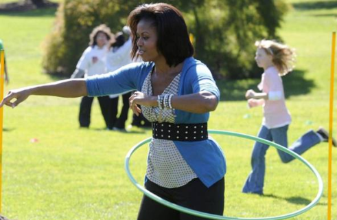 Tra i favoriti il corso di Hula-Fit Total Body Work-Out, basato sul classico cerchio dell’hula-hoop, che consiste nel far roteare intorno ai fianchi un grande cerchio mantenendo la rotazione dando spinte dai glutei, così come fa Michelle Obama nella foto.
