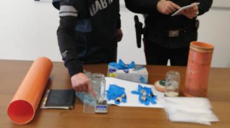 Dapprima ci si concentrava all’interno del locale-officina, dando l’attività esito negativo, quindi ci si spostava nell’adiacente cortile, presidiato dal cane da guardia, che dopo essere stato spostato dall’uomo, su invito dei militari, permetteva di rinvenire il vero “bottino” finemente nascosto. Infatti all’interno del tronco dell’ulivo, in un incavo naturale, l’uomo aveva celato un guanto in lattice blu, della stessa tipologia di quelli trovati nell’officina, con all’interno tre involucri di cocaina ancora grezza del peso totale di circa 20 grammi. Ma i ritrovamenti non si concludevano qui, infatti accanto all’albero vi era un altro tronco reciso, al cui interno vi era della terra smossa. Ritenendo vi potesse essere qualcosa nascosto anche lì, i militari iniziavano a smuovere il terriccio e poco dopo rinvenivano un tubo in plastica arancione, di quelli usati per i bagni, della stessa tipologia di altri pezzi rinvenuti sul bancone dell’officina dell’uomo, con all’interno un barattolo in vetro contenente frammenti grezzi di cocaina pura per un totale di circa 35 grammi ed un bilancino di precisione per la pesatura della sostanza.