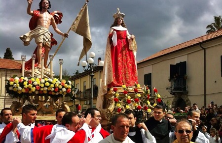 Il Sabato Santo, giorno dell’attesa e della trepidazione mistica, si condenserà nella “Madre di tutte le Veglie” funzione notturna nella quale si compiranno anche le diverse liturgie del Fuoco, della Luce, della Parola, Battesimale ed Eucaristica che culmineranno con la rievocazione della Resurrezione. Domenica spazio alla tradizione pura con la tipica “Affrontata”, la manifestazione pubblica che inizia in processione per le strade adiacenti e sfocia nella gremitissima piazza del Popolo, durante la quale le due statue raffiguranti Maria e Gesù – alla presenza del popolo e delle autorità religiose, civili e militari della città – vengono trasportate a spalla, dai portatori delle diverse parrocchie, per simboleggiare il significativo incontro dopo la resurrezione del Cristo.