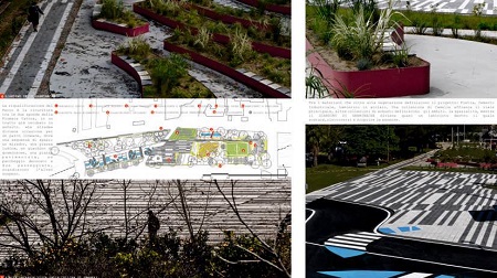 Qui spiega l’architetto “la strada diviene occasione per un parco lineare, dove una sequenza di spazi, un mirador, una piazza ludica, un giardino, una piazza pavimentata, un parcheggio decorato e due passeggiate scandiscono l’alveo sospeso. Un disegno di siepi ricuce e ridefinisce gli ambiti e la spazialità. La piazza centrale ha un carattere dinamico, bicromo, cangiante, mai statico ma, la distanza fa percepire l’armonia del disegno”.