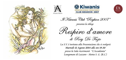 “Respiro d’amore”, l’ultima silloge di Rosy De Fazio, edita da Armenio Editore, sarà presentata dal Kiwanis Club Reghion 2007 (di cui l’Autrice è socia), nella splendida cornice de L’Accademia di Lazzaro – Motta S.S. (RC), il 12 agosto con inizio alle ore 19,30.