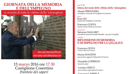 Ha annunciato il suo intervento anche il presidente della giunta regionale Mario Oliverio, alla Quinta edizione della Giornata della Memoria e dell’Impegno in ricordo di tutte le vittime della ‘ndrangheta, che sarà celebrata a Castiglione Cosentino martedì 15 marzo alle ore 17,30.