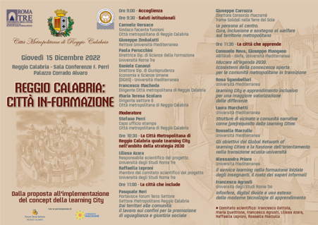 Giovedì 15 dicembre nuovo importante tavolo di studio a Palazzo Corrado Alvaro, a partire dalle ore 9,00, con il convegno dal titolo “Reggio Calabria: Città in-formazione. Dalla proposta all’implementazione del concept della Learning City”, promosso dai vertici della Metrocity in collaborazione con il mondo accademico e con la partecipazione del Forum Terzo Settore di Reggio Calabria e del Consorzio Macramè.