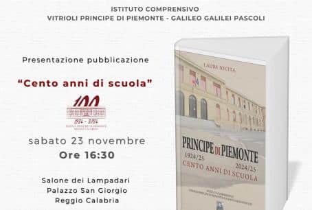 L’Istituto Comprensivo “Vitrioli – Principe di Piemonte-Galileo Galilei – Pascoli”, sabato 23 novembre alle ore 16:30, presso la Sala dei Lampadari di Palazzo San Giorgio a Reggio Calabria, organizza, nell’ambito dei festeggiamenti del centenario della scuola Principe di Piemonte, la presentazione della pubblicazione “100 anni di scuola”, edito dalla Città del Sole Edizioni.