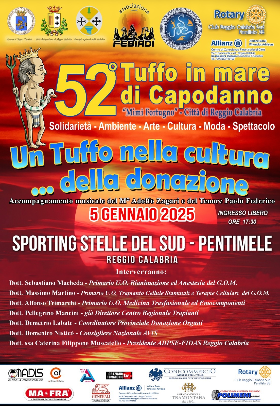 Nell’ambito del 52° Tuffo in mare di capodanno , domani 5 gennaio, si parlerà di cultura della donazione …’di organi e di sangue . Presso lo Sporting Stelle del Sud di pentimele RC, Allietati dalle musiche del M° Adolfo Zagari (fisarmonicista) relazioneranno
