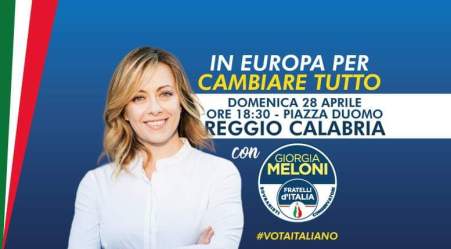 Grande attesa in città per la manifestazione pubblica con Giorgia Meloni, segretaria nazionale di Fratelli d’Italia, in programma domenica sera alle ore 18,30 a Piazza Duomo di Reggio Calabria. L’interesse per la presenza della leader del partito in questa area del Sud, è testimoniato dalle tante importanti adesioni che continuano ad aggiungersi a Fratelli d’Italia. “In Europa per cambiare tutto” è lo slogan scelto per questa corsa al Parlamento Europeo, uno slogan perfettamente in linea con le idee di Fratelli d’Italia volte a ricostruire l’assetto delle attuali istituzioni europee e soprattutto, un’Europa che sia una confederazione di Stati liberi e sovrani.
