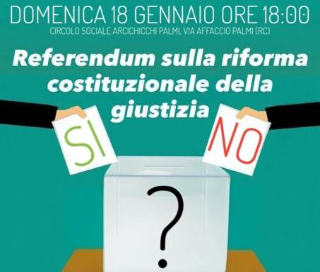 – È importante parlarne. Perché la riforma costituzionale della giustizia non è una materia riservata agli addetti ai lavori, ma una questione che riguarda il funzionamento delle istituzioni e il rapporto tra cittadini e giurisdizione. Con questo spirito, domenica 18 gennaio 2026, alle ore 18:00, il Circolo Sociale Arci Chicchi di Palmi, in via Affaccio, ospiterà un incontro pubblico dedicato al tema, in vista del referendum costituzionale previsto per il prossimo mese di marzo.
