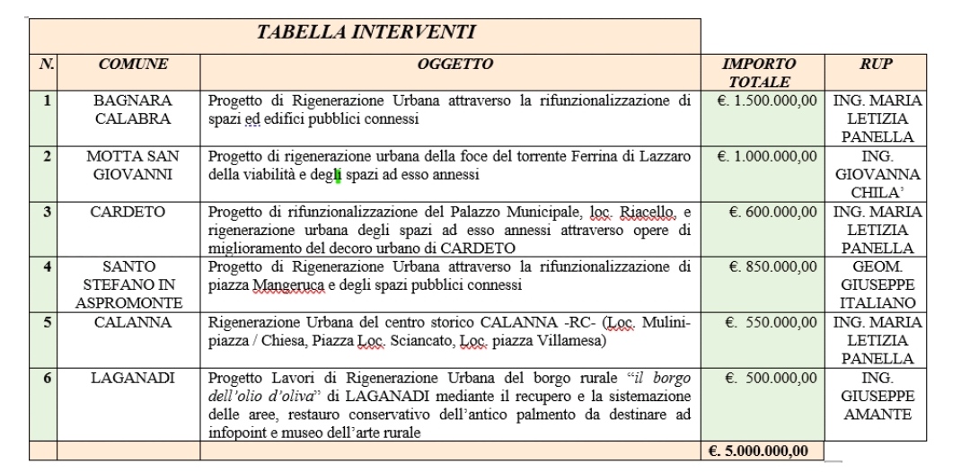 Per gli altri comuni sono stati presentati progetti redatti dai rispettivi uffici tecnici che prevedono anch’essi nel loro complesso interventi di rigenerazione urbana per un totale di 3.500.000,00, ripartiti secondo la convenzione approvata dai rispettivi consigli comunali.