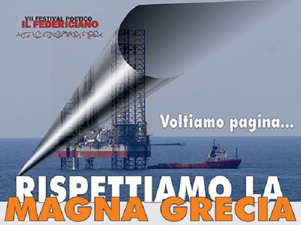Il prossimo 25 Agosto, alle ore 17,00, sul lungomare di Rocca Imperiale, all’ interno del VII Festival “Il Federiciano”, si svolgerà una manifestazione per la tutela del territorio, e in particolare del Mar Ionio, minacciato dalle trivelle di importanti compagnie petrolifere, tal titolo «Rispettiamo la Magna Grecia».