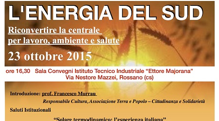 Il 23 ottobre alle ore 16.30 presso l’Istituto Tecnico Industriale “Ettore Majorana” di Rossano si terrà il convegno “Energia del