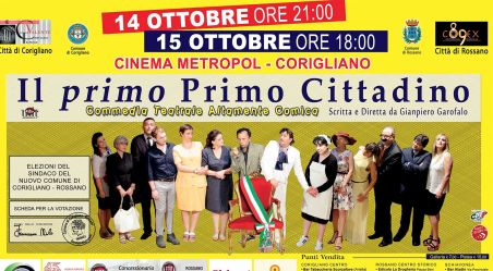 ROSSANO – La Compagnia Teatrale “8&9 Codex” ritorna a calcare il palcoscenico. Si riparte, sempre con costruttiva ironia e con il giusto equilibrio tra commedia e realtà, da una tematica di grande attualità e importanza sociale e politica: il processo di fusione in atto tra le due Città di Rossano e Corigliano Calabro. Insieme alla Compagnia Valente della vicina Corigliano, infatti, sarà portata in scena, i prossimi Sabato 14 e Domenica 15 Ottobre presso il Teatro Metropol di Corigliano, l’ultima opera scritta e diretta dall’istrionico Gianpiero Garofalo “Il primo Primo Cittadino”.