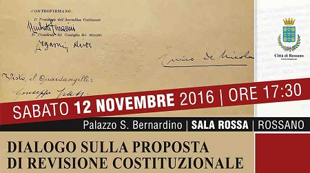 ROSSANO – Giuristi a confronto sul Referendum costituzionale. Si terrà nella Sala Rossa di palazzo San Bernardino, nel Centro storico di Rossano, il prossimo Sabato 12 Novembre 2016, alle ore 17.30, un incontro pubblico promosso dal comitato civico “Sìbaritide per il Sì” al quale interverranno personalità del mondo accademico ed esperti in leggi elettorali.