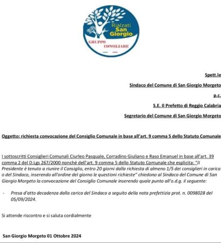Il Gruppo Consiliare “Rialzati San Giorgio”, a margine della non presa d’atto nella decadenza del Sindaco Valerioti da parte dei Consiglieri Comunali di maggioranza durante il civico consenso svolto il 28 settembre scorso su sollecito della Prefettura di Reggio Calabria successivo alla sentenza della Corte di Cassazione che ha dichiarato il candidabile lo stesso Sindaco, ha chiesto la convocazione di un nuovo Consiglio Comunale che dovrà tenersi entro 20 giorni dalla richiesta. Punto all’o.d.g. : “Presa d’atto decadenza dalla carica del Sindaco a seguito della nota prefettizia n. 009028 del 05/09/2024.