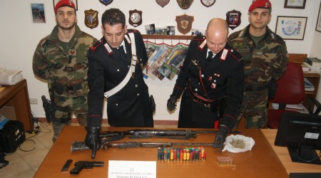 Nel corso di un predisposto servizio di controllo del territorio finalizzato alla prevenzione e repressione dei reati in materia di armi, i militari operanti effettuavano un controllo di polizia presso un ovile sito in località Randaci del comune di San Luca, in zona aspromontana, di proprietà di Domenico Pelle. All’atto del controllo, da cui è scaturita un’attenta ed accurata perquisizione, e’ stato rinvenuto un fucile da caccia, semiautomatico, monocanna, marca Perfex, cal. 12, con matricola abrasa, un fucile da caccia, monocanna, senza marca, cal. 20, con matricola abrasa, una pistola cal. 9×21, marca Sig Sauer, modello p220, con relativo serbatoio, avente matricola nr. g115207 sulla culatta-otturatore, e matricola sul castello abrasa, 61 cartucce per pistola marca Luger, cal. 9×21, 60 cartucce per fucile da caccia, di varie marche e di vari calibri, nonche’ circa 20 grammi di sostanza stupefacente del tipo marijuana. Quanto rinvenuto e’ stato sottoposto a sequestro dai militari dell’arma.