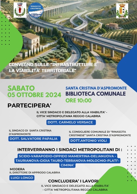 Santa Cristina D’Aspromonte, Convegno su “Infrastrutture e la viabilità territoriale” con numerosi partecipanti. Si terrà sabato 5 ottobre presso la Biblioteca Comunale alle ore 10.