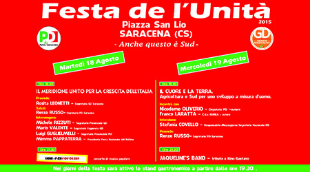 SARACENA (CS) – Ritorna anche quest’anno la “Festa de l’Unità” a Saracena. Il gruppo dirigente e gli iscritti del Partito Democratico e dei Giovani Democratici cittadini hanno deciso di non rinunciare a quest’importante momento di riflessione politica e di aggregazione sociale. Vari dibattiti sul ruolo del Meridione nell’Italia di oggi faranno da sfondo alla due giorni democratica. L’evento si svolgerà il 18 e il 19 Agosto nella centralissima e bellissima Piazza S. Lio. Martedì 18 si partirà con un convegno su “IL MERIDIONE UNITO PER LA CRESCITA DELL’ITALIA” , nel quale interverranno Renzo Russo , segretario della locale sezione del PD e membro dell’Assemblea Nazionale del Partito Democratico; Rosita Leonetti, segretaria GD Saracena e dirigente regionale del PD; Luigi Guglielmelli, segretario provinciale PD; Michele Rizzuti, segretario provinciale GD; Mario Valente, segretario regionale GD e Mimmo Pappaterra, Presidente del Parco Nazionale del Pollino. La serata del 18 sarà allietata dalla musica degli “Inni Pierpolari” . Mercoledì 19 si parlerà di “ Agricoltura e Sud per uno sviluppo a misura d’uomo” con l’importante contributo dell’ on. Nicodemo Oliverio , deputato e autore del libro “Il Cuore e la Terra”; dell’on. Franco Laratta, cda Ismea e autore del libro “Il Cuore e la Terra”;concluderà i lavori l’ on. Stefania Covello, responsabile Mezzogiorno e Fondi Europei nella Segreteria Nazionale del Partito Democratico. A seguire, chiusura della festa con lo spettacolo musicale della “JACQUELINE’S Band – Tributo a Rino Gaetano“.