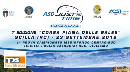 Si terrà il 23 settembre prossimo ore 9:00 presso il Lungomare di Scilla (RC) la terza tappa (1 Tappa Sicilia- 2 Tappa Puglia- 3 Tappa Calabria) del Campionato Nazionale Mediofondo Centro Sud Acsi Ciclismo, denominata “Corsa Piana delle Galee”, evento sportivo di grande spessore che vedrà la partecipazione di ciclisti provenienti dalla Sicilia, dalla Puglia e dalla Calabria. Al vincitore che avrà completato il percorso della “Corsa Piana delle Galee” in tempo minore e nella classifica delle 2 precedenti tappe Castiglione (Sicilia) e Lecce (Puglia) abbia raggiunto il miglior punteggio verrà assegnata la maglia di “Campione Nazionale Mediofondo Centro-Sud” (Sicilia-Puglia-Calabria).
