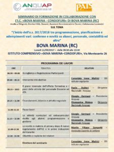 Oggi, 11 settembre,a Bova Marina, nell’aula magna dell’Istituto Comprensivo “Bova Marina Condofuri”, diretto da C. Irene Mafrici, dalle 8.30 alle 13.30, si terrà un seminario di formazione rivolto a Dirigenti, Direttori Sga, Docenti, Assistenti Amministrativi e Tecnici, Collaboratori scolastici. Il tema dell’importante simposio, organizzato,( associazione nazionale quadri delle amministrazioni pubbliche), sarà: “L’inizio dell’a.s. 2017/2018 tra programmazione, pianificazione e adempimenti vari: conferme e novità su alunni, personale, contabilità ed altro”. Il seminario, che si terrà in collaborazione con lo stesso istituto comprensivo, intende fornire un quadro generale di riferimento sulle maggiori attività di programmazione e pianificazione di inizio anno scolastico, nonché sugli atti di maggior rilievo con i quali le scuole si debbono misurare. Dopo l’accoglienza e la registrazione dei partecipanti vi saranno i saluti da parte del dirigente scolastico C. Irene Mafrici seguiti dall’intervento di Paolo Stalteri , Dirigente Nazionale Anquap, su “ Il piano triennale dell’offerta formativa e i piani delle attività del personale Docente ed ATA” . Giorgio Germani , Presidente Anquap, Giuseppina Malara , Dirigente Nazionale Anquap tratteranno il tema “ Finanziamenti, bilancio e attività negoziale . Dopo una breve pausa dei lavori “ Le attività curriculari ed extracurriculari rivolte agli alunni: programmazione e gestione” saranno trattate sempre da Giorgio Germani e Giuseppina Malara. Manlio Filippo Zampetti, Avvocato Esperto di Settore, parlerà, invece, delle “ novità in materia di privacy dopo il nuovo regolamento dell’UE e le prime indicazioni del garante” . La giornata di studio si concluderà con il dibattito e le repliche dei relatori