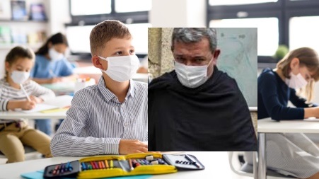Small children with face mask back at school after covid-19 quarantine and lockdown.