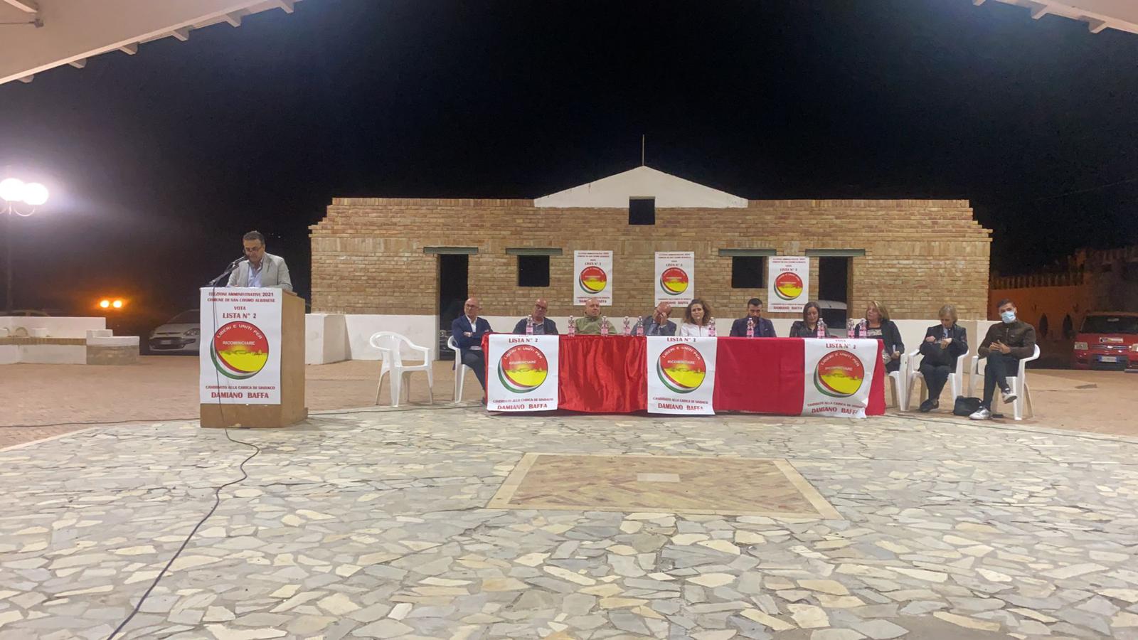 Il sindaco Baffa, dopo un breve intervento dei candidati a consigliere, ha chiuso l’ultima serata della sua campagna elettorale. Un intervento appassionato, partito dall’impegno profuso e dai successi ottenuti in questi anni: “Quando sono arrivato nella sala consiliare ho trovato tanti problemi: un comune praticamente in dissesto, furti e un paese ormai abbandonato ad un triste destino. In questi anni non ci siamo arresi, abbiamo fatto tanto senza intaccare le casse comunali, grazie ad un attento lavoro di progettazione e monitoraggio delle opportunità derivanti da finanziamenti pubblici. Azioni che sembravano miraggi nel deserto sono diventate realtà: dall’ammodernamento della rete idrica ai sistemi di videosorveglianza, dalle opere pubbliche in fase di avvio, come il nuovo campo sportivo, a quelle già concluse, come la piazza davanti il nostro bellissimo santuario. – Poi continua – in questi anni siamo riusciti a portare San Cosmo all’attenzione dell’agenda nazionale, grazie all’Expo Arbёreshё e al prossimo documentario del National Geographic, e internazionale, creando un ponte diretto con l’Albania che partirà presto per salvaguardare la nostra storica lingua”.