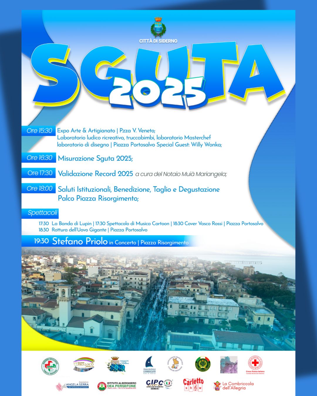 Il programma prevede la misurazione della sguta (che quest’anno raggiungerà i 545 metri per abbattere il record precedente) alle 16:30, mentre il record verrà validato dal notaio Mariangela Muià alle 17:30. Quindi, il momento del taglio, della benedizione e della degustazione (che farà seguito ai saluti istituzionali sul palco di piazza Risorgimento previsti alle 18) verrà preceduto dagli spettacoli de “La banda di Lupin” e di Musica Cartoon. A seguire la rottura del gigantesco uovo di cioccolato e il concerto della cover band di Vasco Rossi in piazza Portosalvo, mentre la manifestazione si concluderà con la performance del cantautore Stefano Priolo sul palco di piazza Risorgimento.