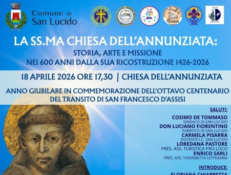 In occasione dell’Ottavo Centenario del transito di San Francesco d’Assisi, sabato 18 aprile, alle ore 17:30, ospiterà un convegno dedicato alla valorizzazione dell’antica chiesa dell’Annunziata in vista dei Seicentenario dalla sua costruzione.