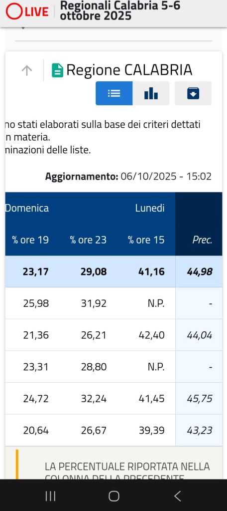 Il dato emblematico in Calabria e in Italia la decisione degli elettori di abbandonare le urne, il 43% nel 2025, il 57% dei votanti che non si recano ai seggi. Un dato eclatante, che rimarca l’allontanamento dei cittadini dalla politica. Adesso ci vuole una pacificazione regionale per far uscire la nostra Regione dalla palude politica -amministrativa. Intanto Domani, martedì 7 ottobre, il presidente Roberto Occhiuto arriverà alla Cittadella regionale di Catanzaro alle ore 11.