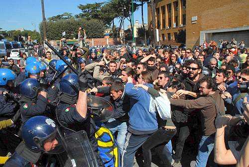 Giovedì 17 novembre, il giorno dopo la formazione del nuovo governo guidato da Mario Monti, gli studenti italiani scendono nuovamente in piazza in 60 città italiane per “denunciare ancora una volta la drammatica situazione in cui versa l’istruzione e la condizione giovanile nel nostro Paese e delineare quello che secondo noi deve essere il percorso di rilancio di un’intera generazione e di tutta l’italia”. Rivendicazione giusta e sacrosanta, soprattutto dopo gli interventi dell’oramai ex ministra dell’Istruzione, Gelmini, che ha messo in ginocchio l’organizzazione ed il buon funzionamento della scuola di ogni ordine e grado. Ancora una volta, però, non si possono accettare e condividere le modalità con le quali oggi soprattutto nelle piazze di Palermo, Milano e Torino gli studenti hanno manifestato. A Milano il corteo di protesto è iniziato con una rissa che ha visti coinvolti due gruppi di giovani manifestanti che hanno iniziato a lanciare fumogeni ad altezza del volto, e l’inviato del Fatto Quotidiano è stato colpito, rimanendo ferito. Ed ancora tensioni e lancio di uova contro le università Cattolica, Bocconi. Attorno alle ore 10 poi, dei giovani del centro sociale “Cantieri” si sono scontrati con quelli del collettivo “Ab. Out”. Calci, pugni e fumogeni ancora ad altezza d’uomo si sono impossessati della protesta. I pacifici, si fa per dire, contestatori, hanno attraversato le vie della città imbrattando letteralmente con scritte ed uova diverse vetrine di filiali bancarie. Giunto presso Corso Italia, il corteo dei manifestanti ha incontrato i poliziotti disposti a cordone per impedire l’avanzata. A questo punto una parte del corte ha seguito la direzione prestabilita ed un’altra, invece, facente capo a “Lab.out” e “Rete studenti”, hanno cercato con la forza e la violenza di forzare il blocco per recarsi sotto la finestra dell’ufficio presso l’università Bocconi, del prof. Monti, neo – presidente del Consiglio. Insomma una modalità di protesta assolutamente da condannare. E scene simili si sono viste anche a Palermo e Torino. Cari studenti, queste modalità di proteste rischiano di svuotare di senso la vostra protesta, svilendola e conducendola ad un effetto nullo!