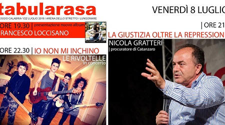 Ma le sorprese di Tabularasa non si fermano alla serata dell’8 luglio. Giusto per segnalare alcuni degli eventi in programma, sabato 9 luglio, a partire dalle ore 21, altri due ospiti d’eccezione: Diego Cugia, ideatore e anima del popolarissimo “Jack Folla”, il dj condannato a morte negli Stati Uniti, al quale viene concesso di trasmettere su una radio italiana (Radio 2) la musica della sua vita, e a seguire Giulio Cavalli, attore e scrittore molto noto per il suo impegno civile che presenterà il suo ultimo libro e si esibirà in un monologo. Ancora, lunedì 11 si parlerà di immigrazione e accoglienza con il sindaco di Riace Mimmo Lucano e l’inviata di guerra Barbara Schiavulli, mentre martedì 12 luglio sarà la volta degli scrittori calabresi Gioacchino Criaco, Mimmo Gangemi, Paola Bottero e Lou Palanca.